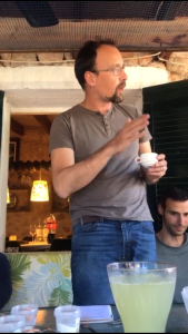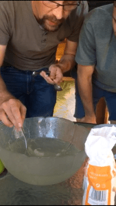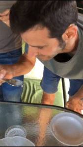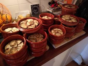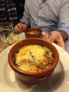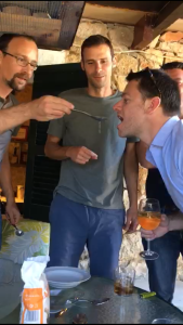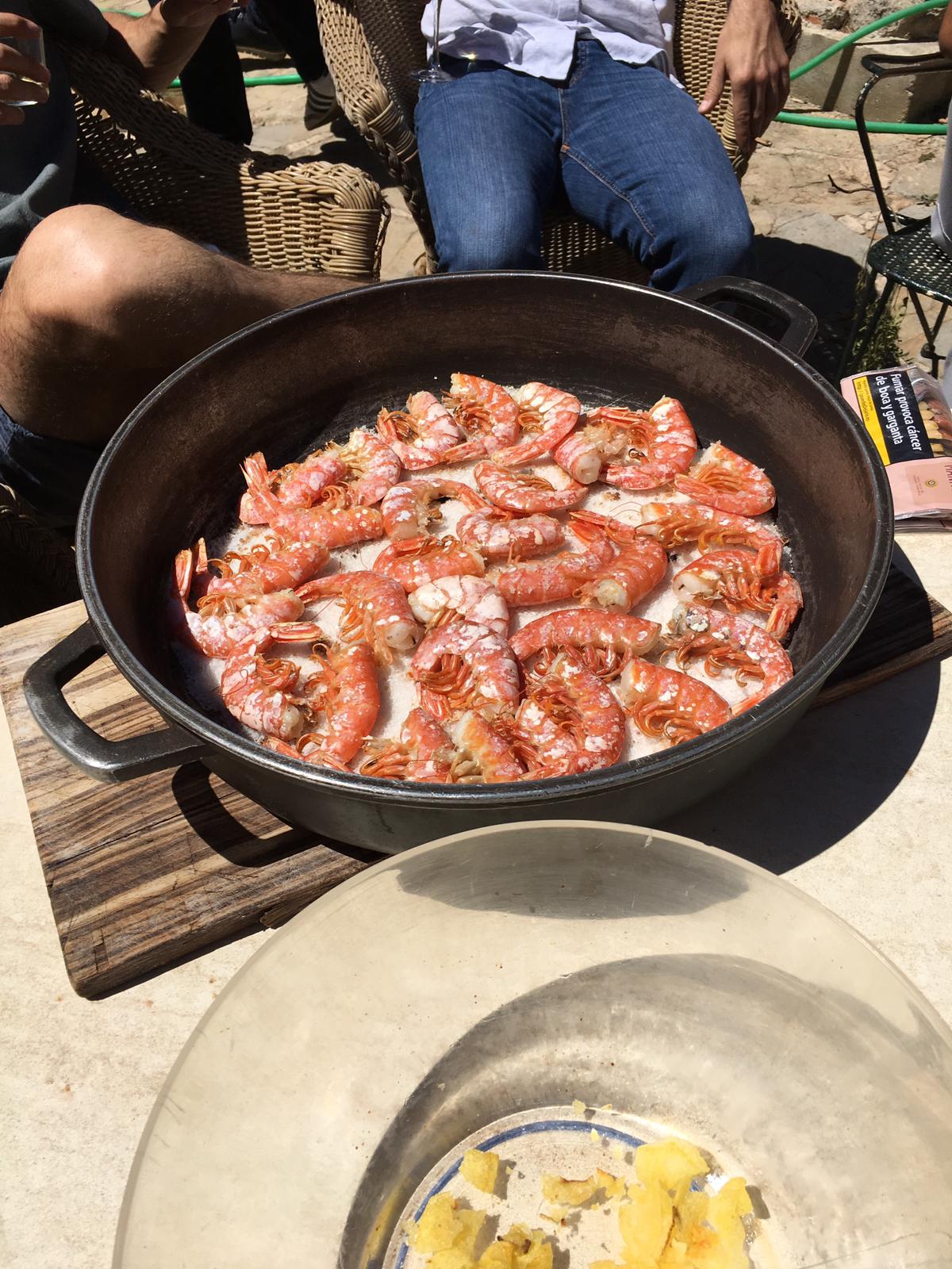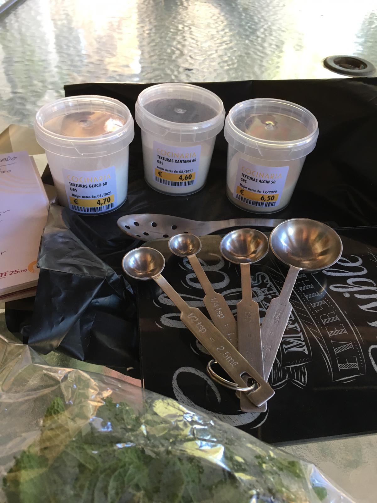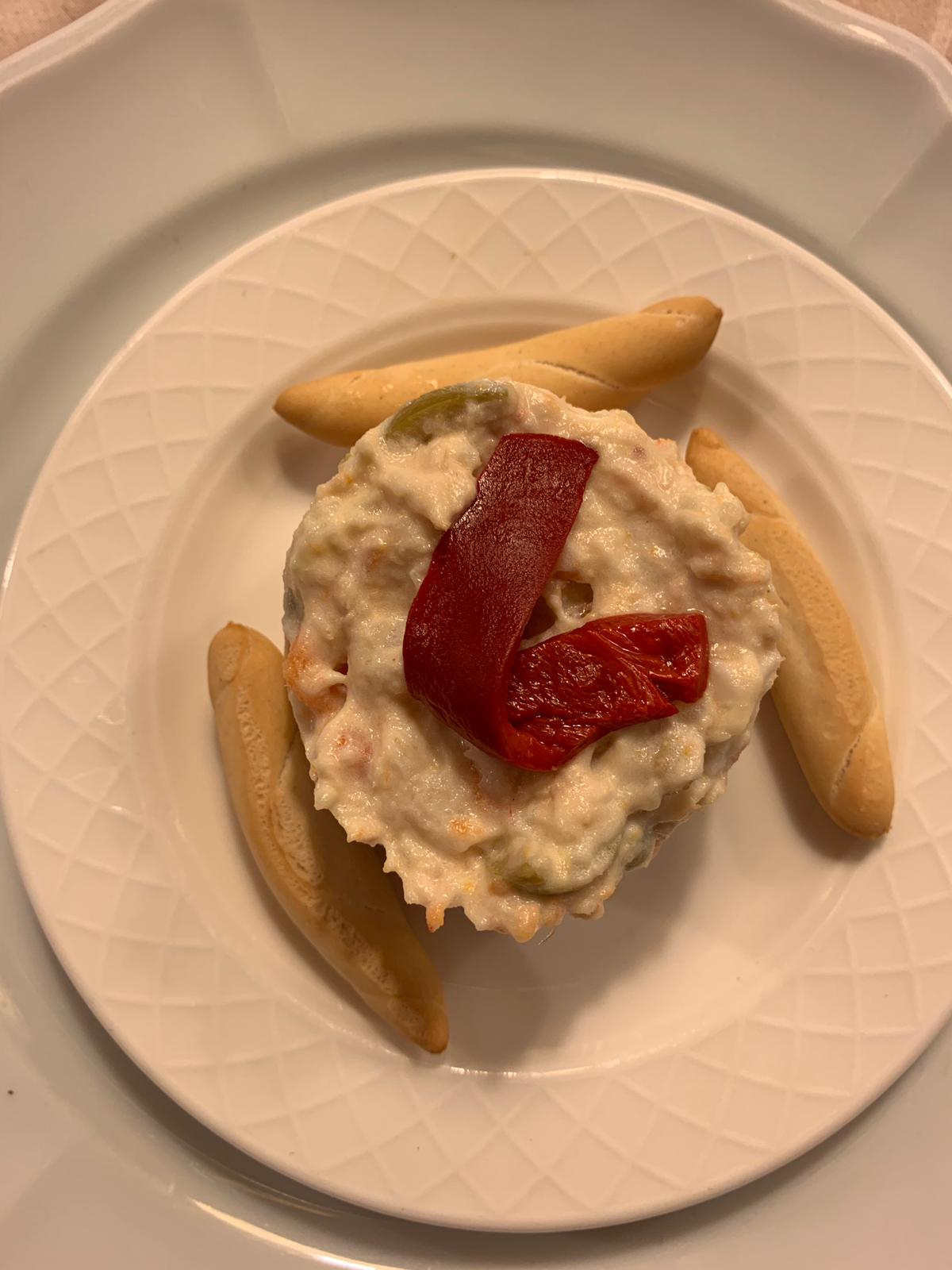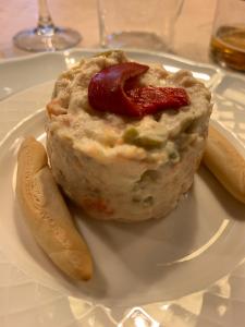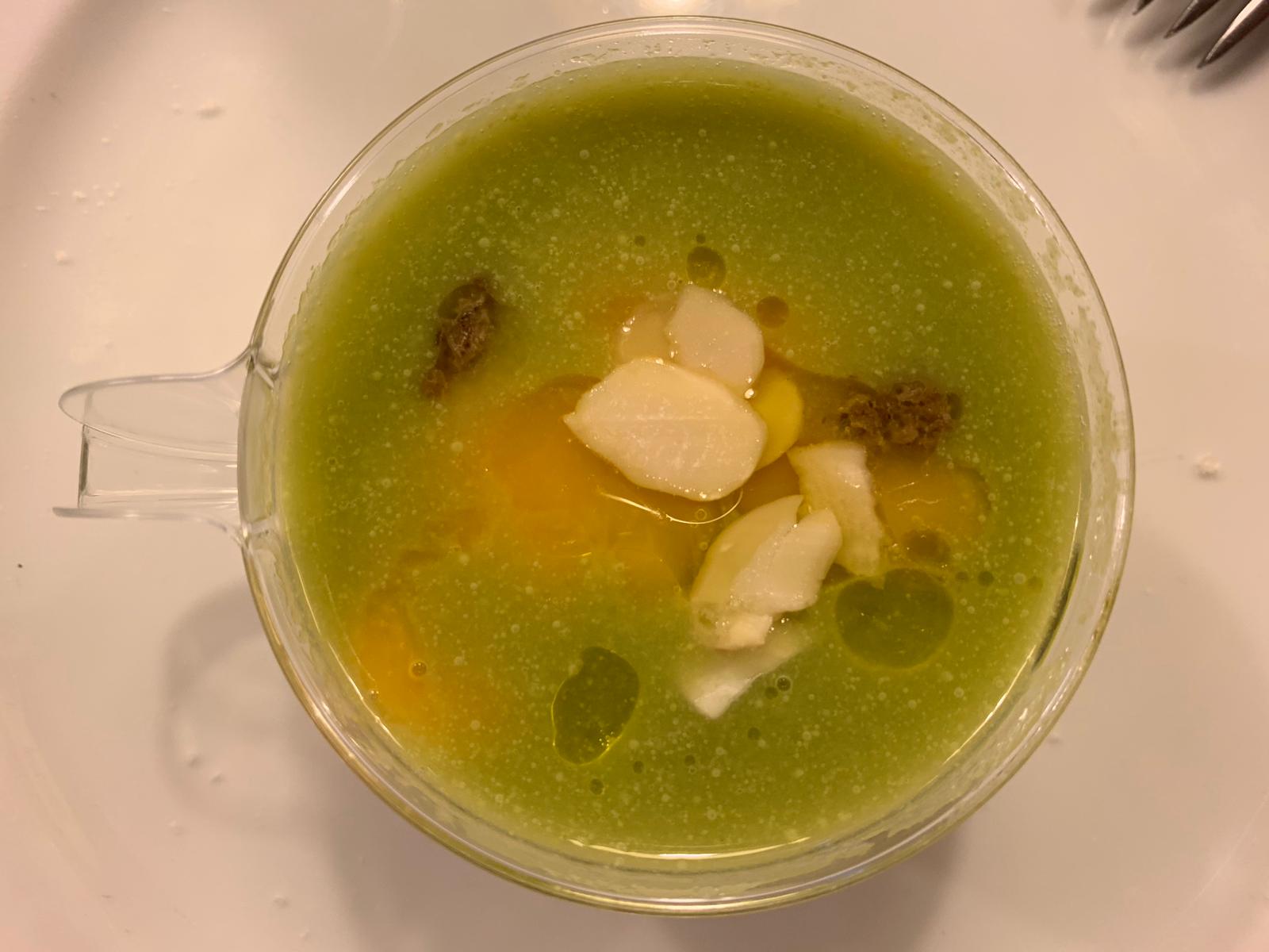 Ensaladilla rusa con gambas. Yema de huevo primaveral con crema de guisantes y reduccion de trufa