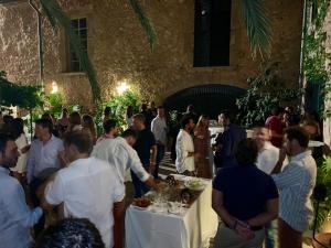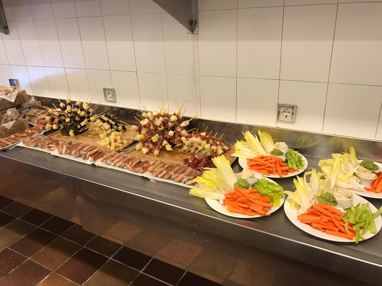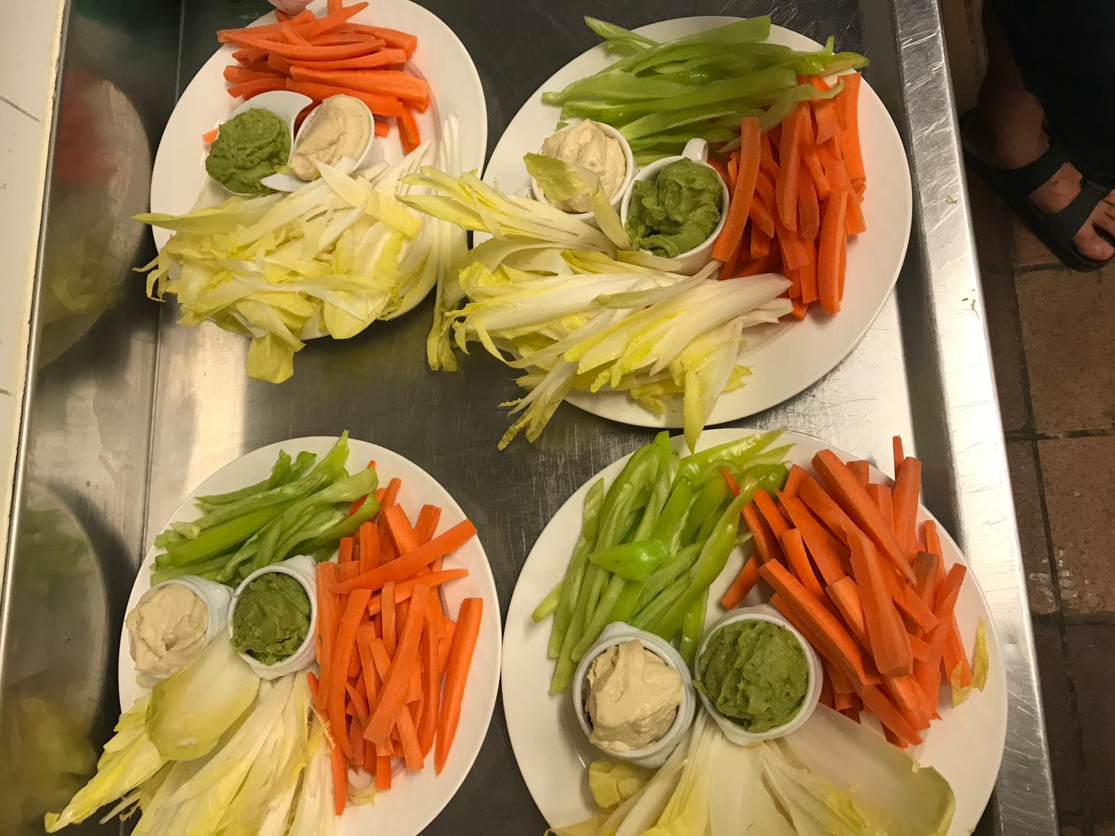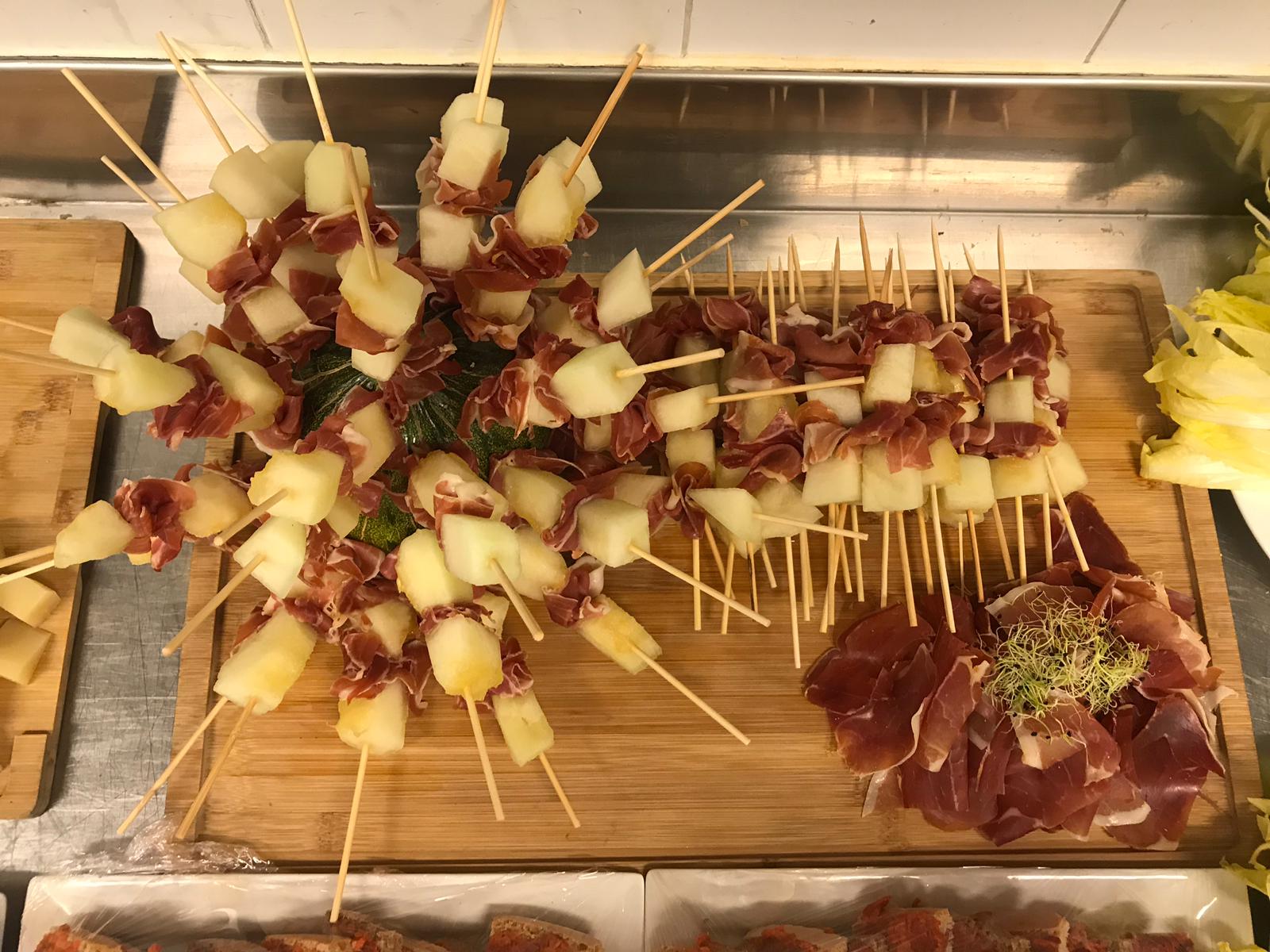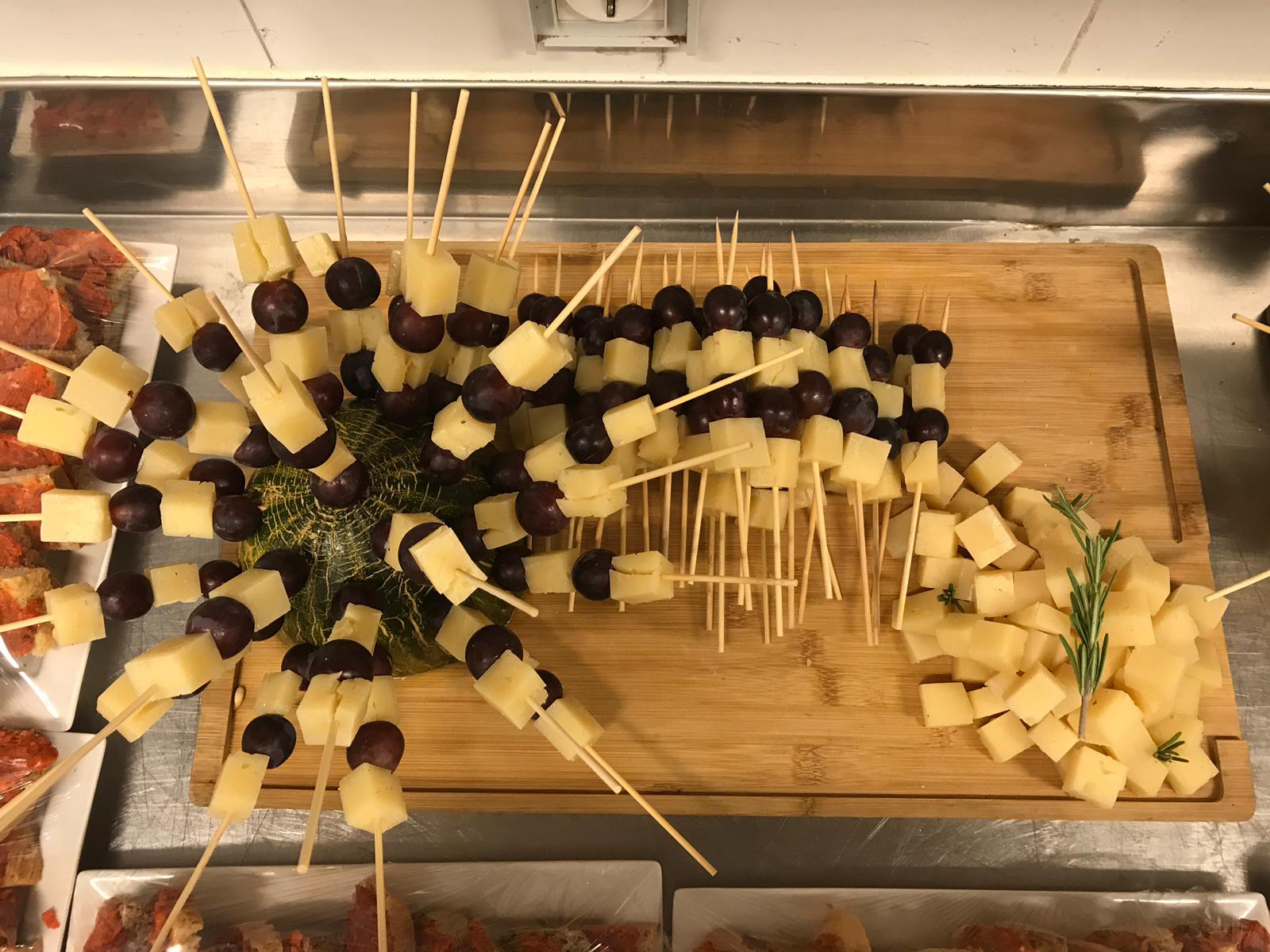 Brochetas de queso con uvas. Brochetas de Jamón Serrano con melón. Crudités con humus y guacamole. Sobrasada de matançes de Ca’n Nofre (Llubí)