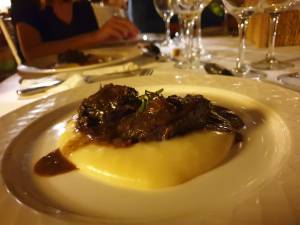 «…segundo round, casquería gourmet, hace unos años unas carrilleras figuraban en pocos menús, receta sencilla de chupchup, como nos gusta a los que nos educamos en la clásica cocina de batalla. Cocinadas a fuego lento con un vino tinto sencillo, reduciendo la salsa y haciéndola brillante para glasear las carrilleras. Acompañadas con una Parmentier de patata con un toque de aceite de trufa blanca. Es la primera vez que cocinamos esta receta, y no será la última después de probarla a lo largo de su elaboración. Buen provecho….»