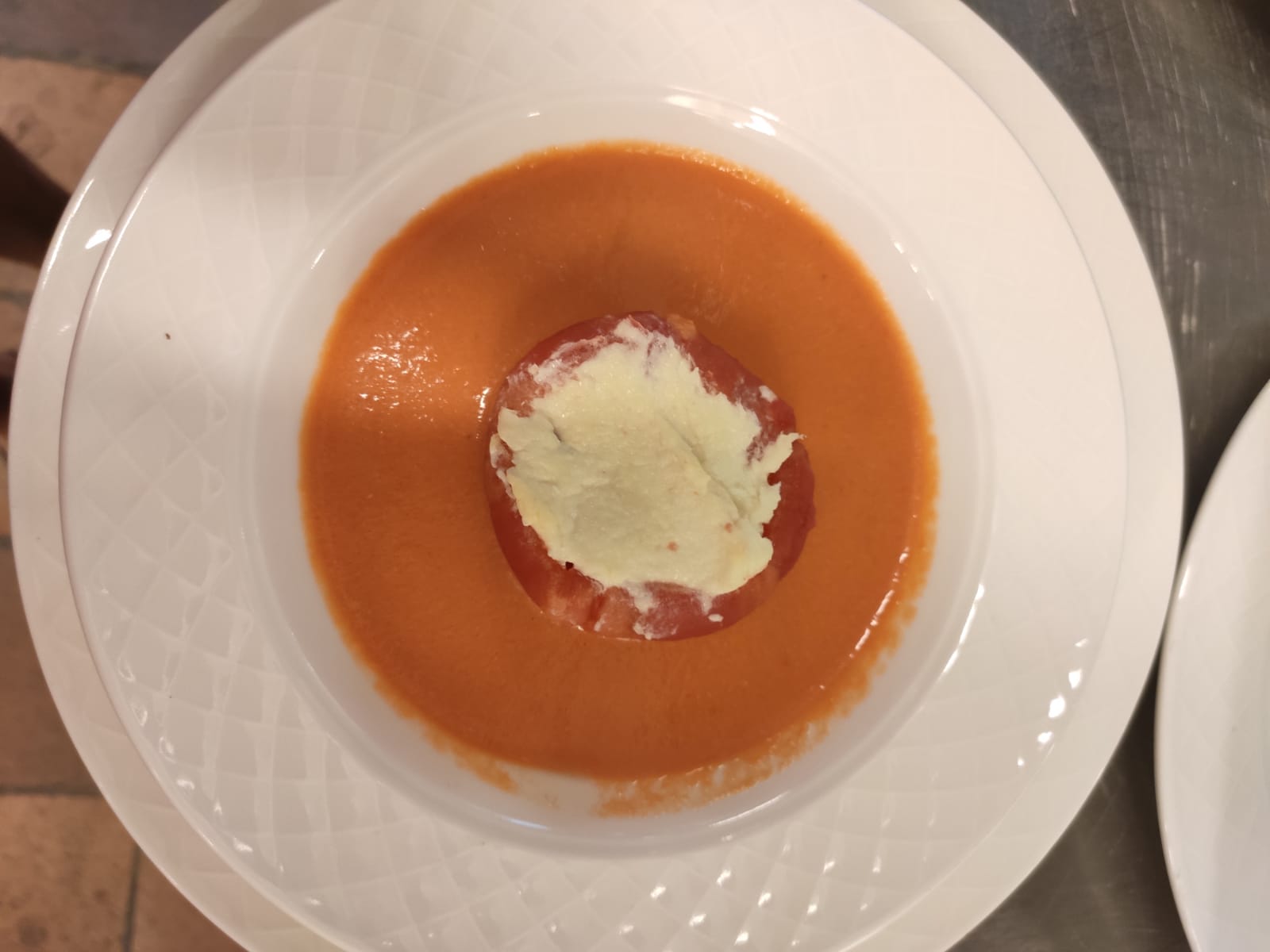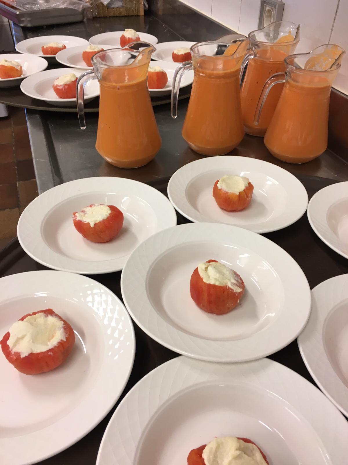 …»primer plato , un gazpacho clásico, excepto por la ausencia de cebolla según receta de Perico, equilibrado y coronado por tomate relleno de Brandada de Bacalao, desalado con todo el cariño para conseguir, al menos eso pretendemos, que dos en uno se combinen de forma armoniosa. Que sea de vuestro agrado….»