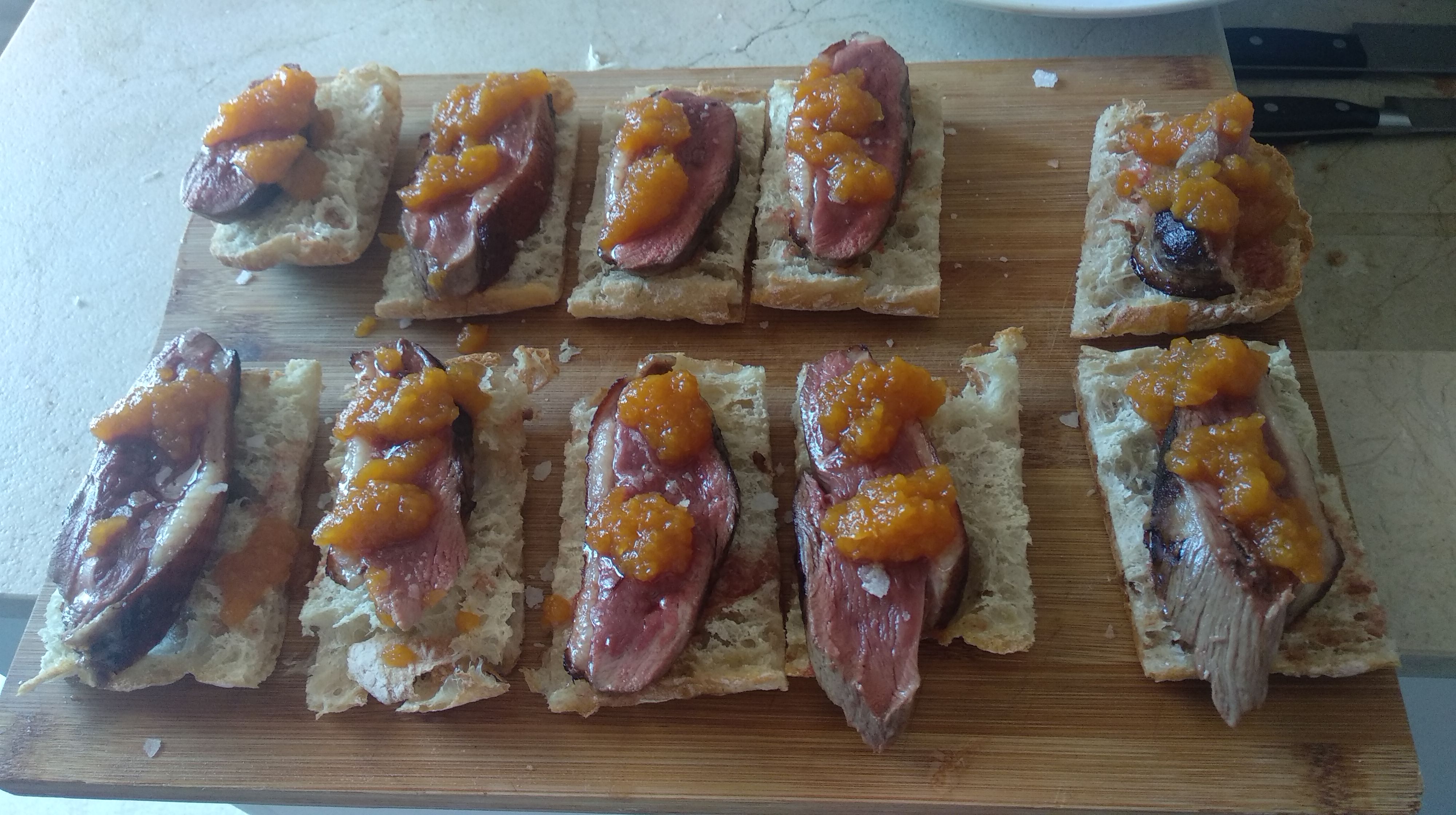 - Pintxo de magret de pato con mermelada de níspero (hecho en Son Pere Nofre durante confinamiento) sobre pan de cristal.
