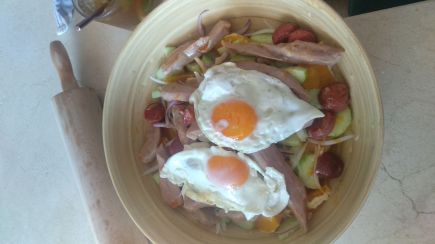 - Mezcla en el bol el aliño que quedaba de la ensalada con el aceitillo que ha quedado en la sartén tras freír la carne el chorizo y el ajo picado. Échalo por encima de la ensalada y de los huevos.