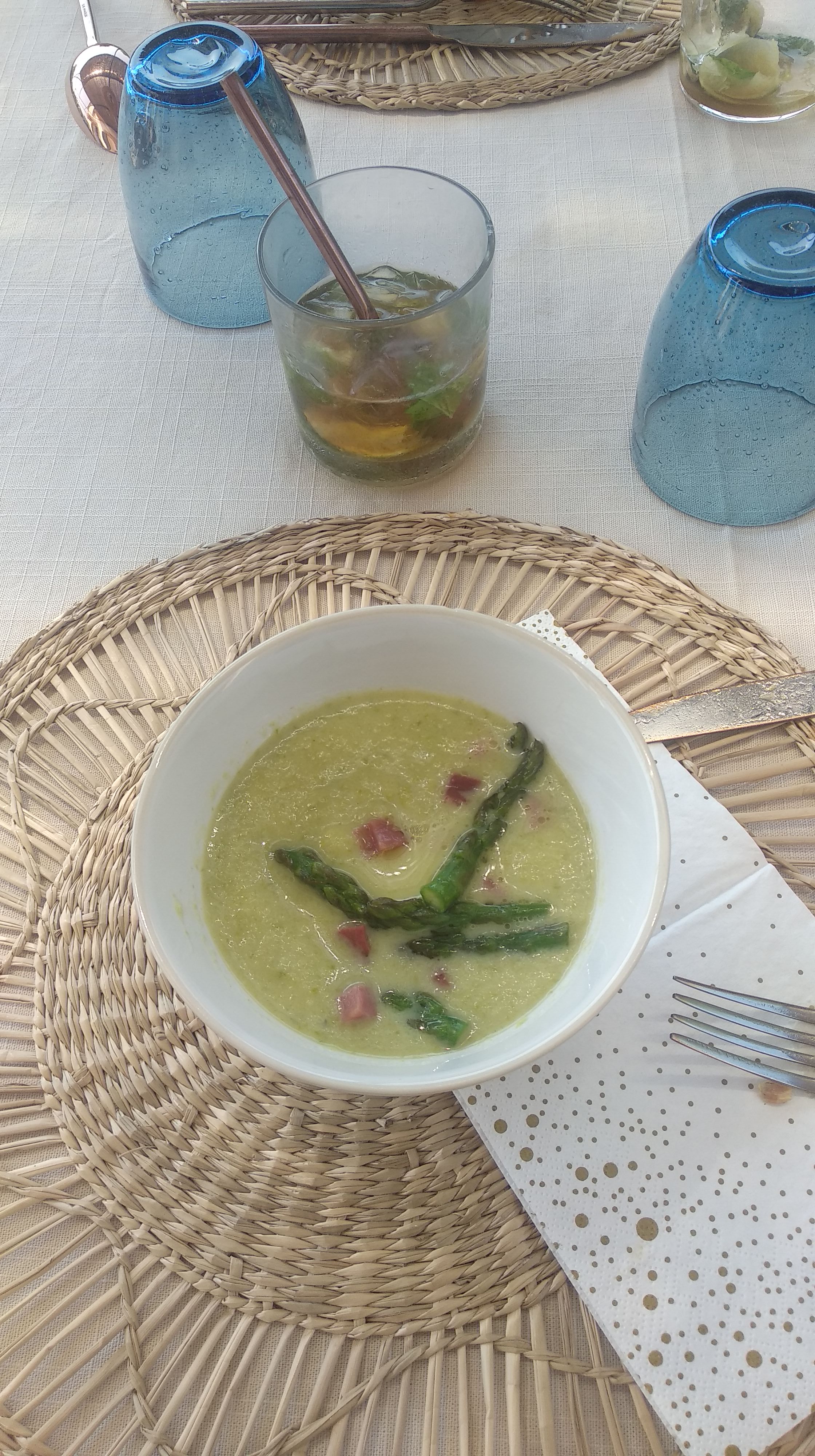 Primer primero: Crema de espárrago fría con taquitos de jamón