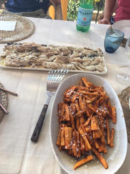 Plato principal: Corvina al horno de vapor con batatas al horno: