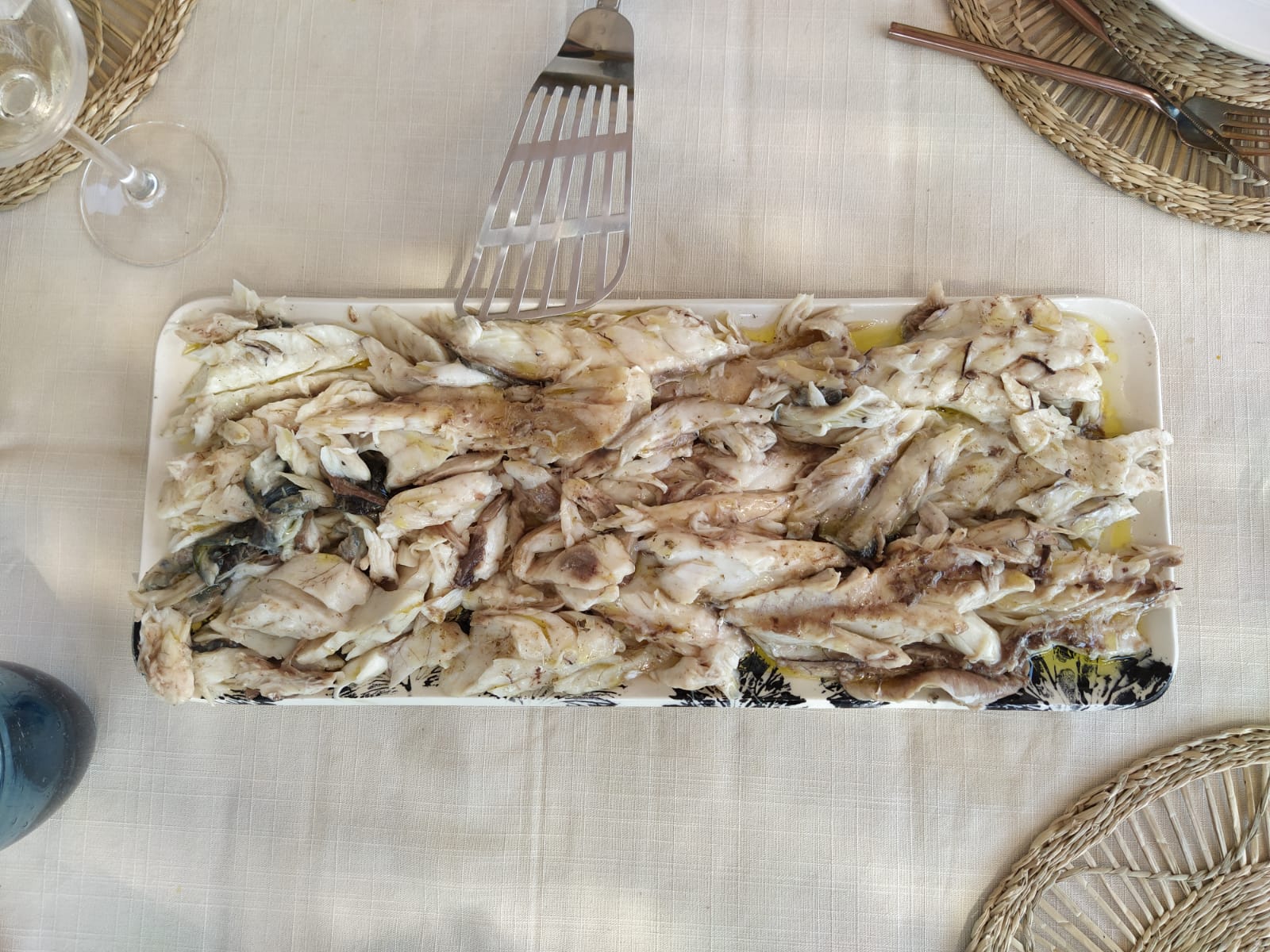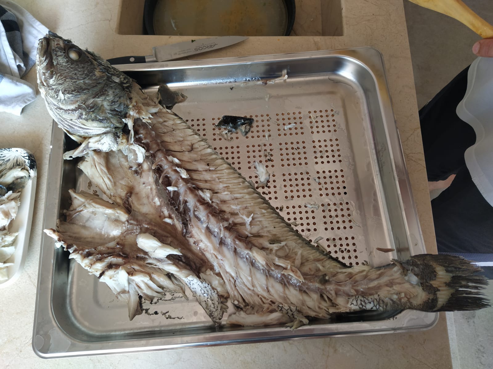 Se ha introducido las 2 corvinas enteras (limpias, sin abrir y con cabeza y cola) en un horno de vapor, sin sal ni aceite de ningún tipo.