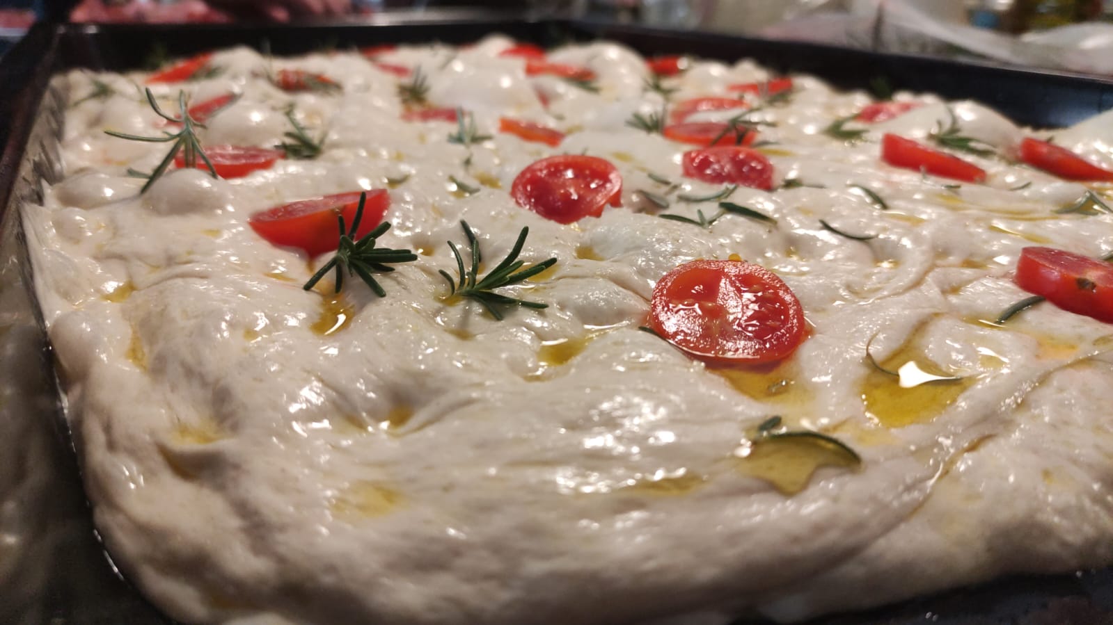 Ahora toca hacer con los dedos de la mano, las presiones para dar la forma de cráteres característica y una vez conseguido se vierte aceite romero y sal en escamas (yo le añadí tomates Cherry) aquí ya va al gusto teniendo en cuenta que esto irá al horno 25 minutos mas o menos.