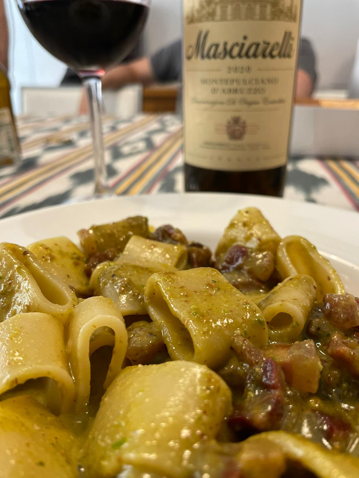 “Siento que estoy paseando por la Toscana” indica Luigi de la Fonti al saborear la pasta al pesto de pistachos