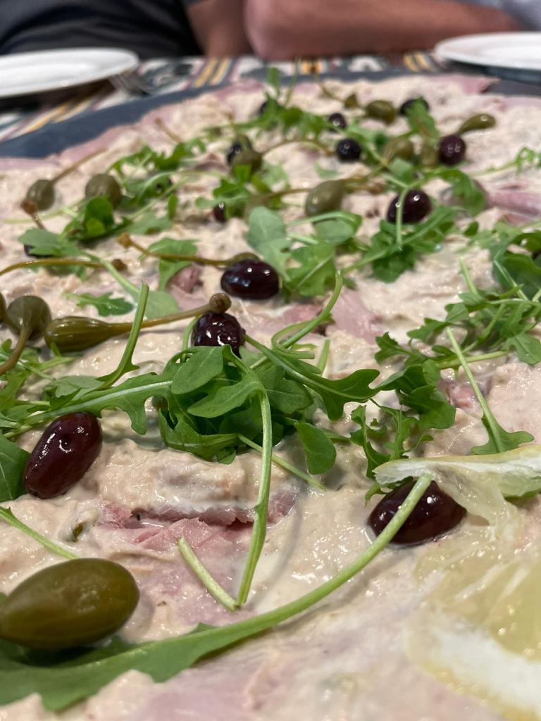 A continuación hacemos la salsa. Ponemos en un vaso mezclador los ingredientes y batimos hasta obtener una textura cremosa. Enfriamos y vertemos sobre la carne antes de servir. Adornamos con aceitunas, alcaparrones y rúcula.