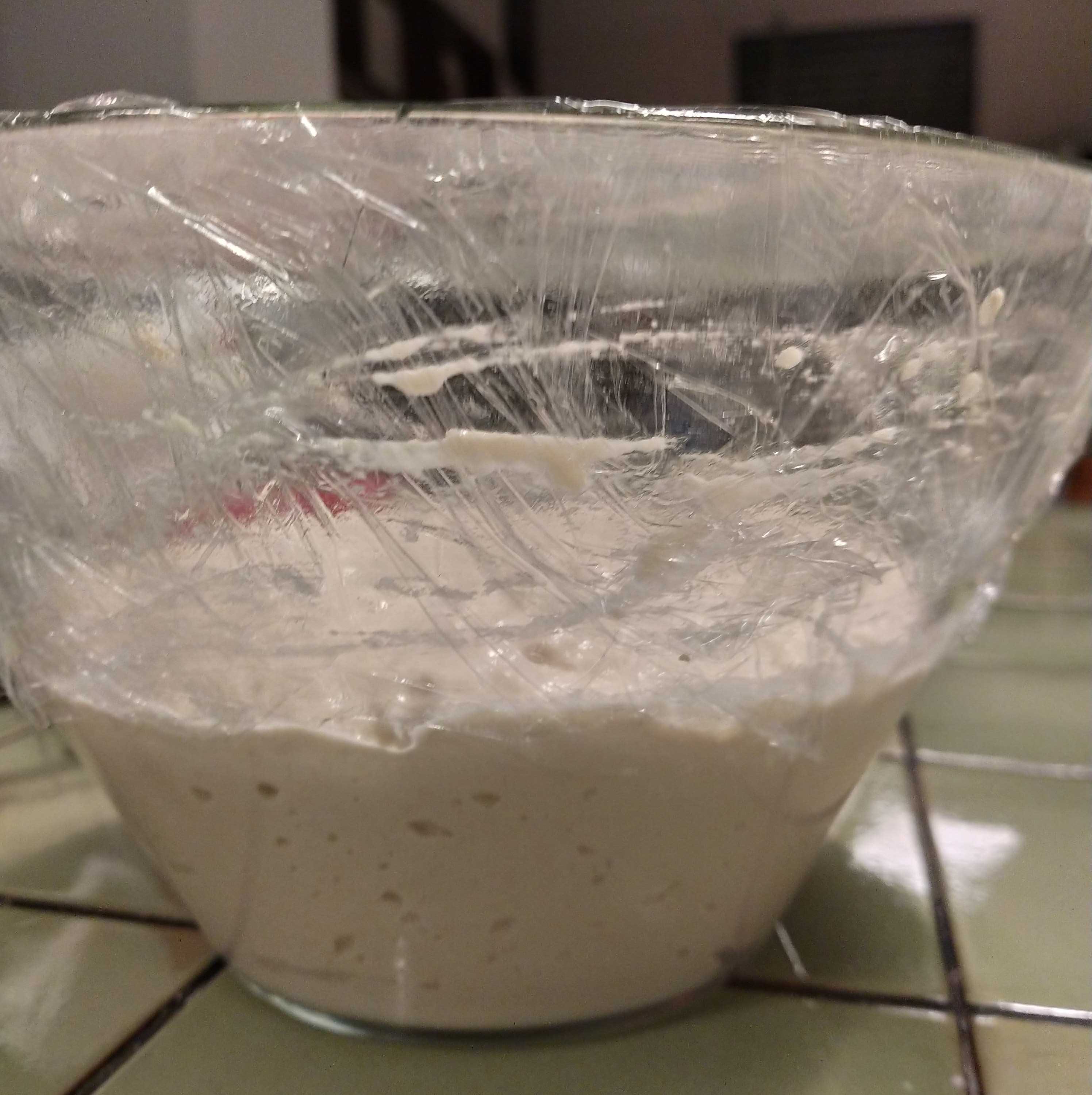 Vertemos la masa en la bandeja (debe de ser profunda para que nos salga alta) y con las manos con aceite levantamos la masa levantando a la vez por ambos lados, con un par de movimientos, la masa se pondrá tersa. Rociamos un poco de aceite por encima de la masa y tapamos la bandeja por 1 hora.