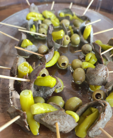Las GILDAS POBLERAS, son banderillas típicas del pueblo de Sa Pobla. Normalmente llevan higado de cerdo aunque para esta ocasión hemos utilizado filetes de ternera cortados muy finos. Se sofríen en aceite con ajos, guindilla/s (si gusta) y laurel. Cuando el hígado cambia de color estará prácticamente cocinado. Dejaremos que se conserven en aceite hasta que decidamos montarlos. Para ello cortaremos el hígado en tiras e iremos insertándolo en un palillo conjuntamente con una piparra y una oliva (suelen ser rellenas de pimiento picante)