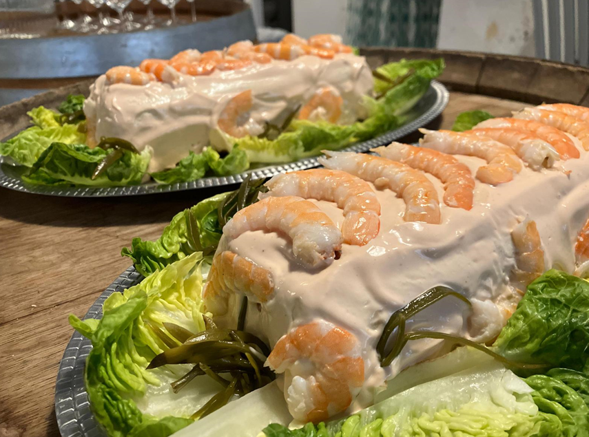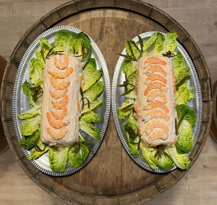 Hervir el rape (600-700gr), una cebolla, una hoja de laurel, clavos y sal durante 10minutos. Hervir las gambas (500kg) en la misma agua. Cocer los mejillones al vapor (1kgr_nosotros no hemos puesto). Picar el rape junto con las colas de las gambas (y los mejillones). Mezclar el pan con la leche y agregar a la mezcla junto con 3 yemas, un poco de nuez moscada y sal. Untar la mantequilla en un molde y verter en él la preparación del pescado previamente mezclado con las claras de huevo batidas a punto de nieve. Cocer al baño maría durante 30 minutos y finalizar en el horno durante 10min. Una vez frio reservar en la nevera. Desmoldar y decorar al gusto con la salsa rosa por encima