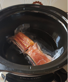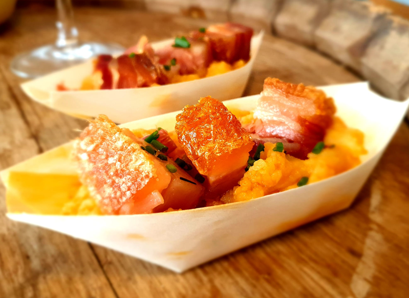 Los TORRUIZNOS CON PATATAS REVOLCONAS reciben este nombre en honor a su creador C. Ruiz. Panceta ibérica envasada y cocinada a baja temperatura (Crockpot) durante 5 horas y frita en una sartén (también se pueden hacer en el horno) hasta que queda bien crujiente.