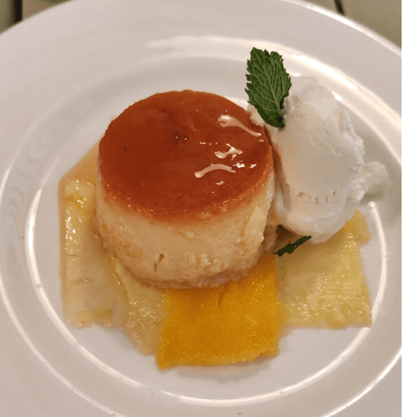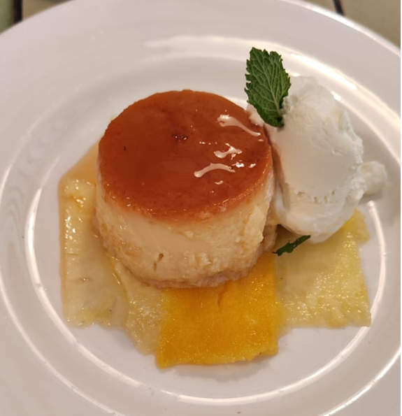 FLAN DE HUEVO CON CARPACCIO DE PIÑA Y CHANTILLÍ . (12 uds) Empezamos poniendo al fuego hasta que hierva: la leche (1), el azúcar (400gr), la piel de un limón (sin la parte blanca) y un bastón de canela. Por otro lado, batimos los huevos (8 uds.) y cuando se atempere la mezcla se lo incluimos, removemos y lo colamos. Paralelamente haremos caramelo (200gr azucar + un poco de agua) , lo verteremos en las flaneras y seguidamente pondremos la masa de flan elaborada. Precalentaremos el horno e introduciremos los flanes al baño maría a una temperatura de 170ºC hasta que estén cuajados. Los dejaremos enfriar antes de guardar en la nevera.