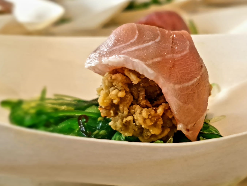 Las ORTIGUILLAS DE MAR (o Anemonia sulcata) típicas de Menorca y el sur de España, las hemos hecho rebozadas y fritas. Importante sacarlas directamente del congelador para que no se ablanden y freírlas hasta que estén bien doradas(aproximadamente 2 min). Una vez atemperadas, se colocan sobre un nido de alga wakame y en modo niguiri cubrimos con ventresca de atún. La ventresca debe cortarse fina a partir de la pieza congelada y dejar sobre un papel absorbente para que absorba el exceso de agua antes usarla en la elaboración.