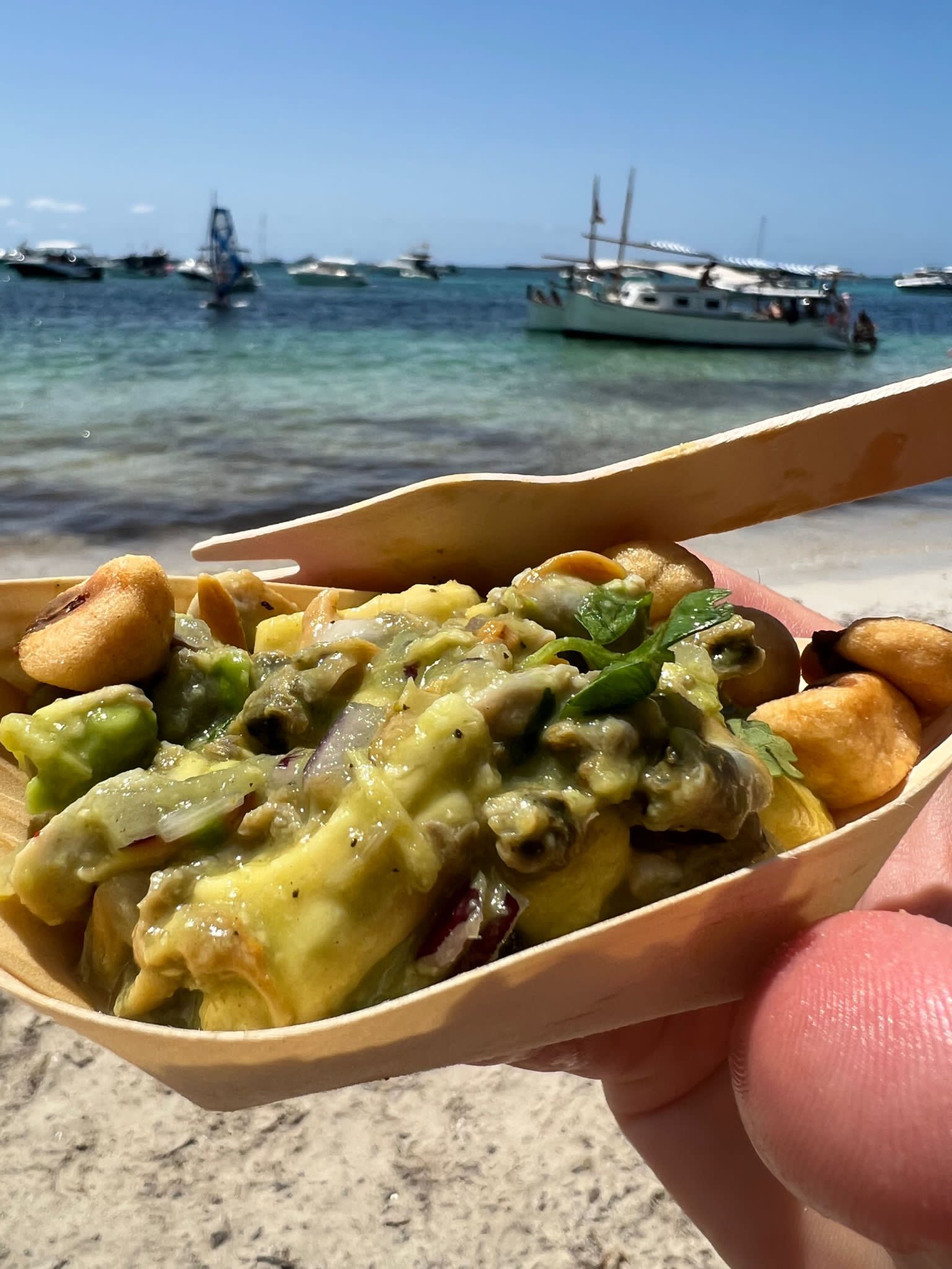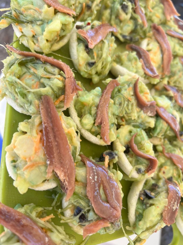 Ceviche de berberehos: se prepara una base con trozos de aguacate un toque de lima y cilantro. De la lata de berberechos se aprovecha la mitad del líquido. Se mezcal todo, se le da un toque de pimienta negra y se le añaden los kikos grandes. Emplatado en barquitos de bambú que le da un toque marinero