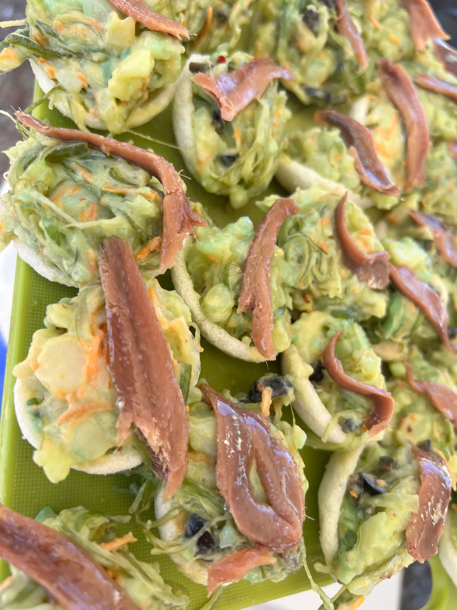 Ensaladilla rusa de wakame: empezamos preparando una ensaladilla rusa con solamente patata hervida y huevo duro porque el toque principal de el plato es el wakame y no le queremos quitar protagonismo. Para darle el punch se adereza con mayonesa de siracha picante, que le da un aire canallita. Para emplatar se hace sobre un pan de gamba de bolsa y se corona con una anchoa. Es importante servir y comer directamente porque el pan de gamba empapa muy rápido y pierde el toque crujiente