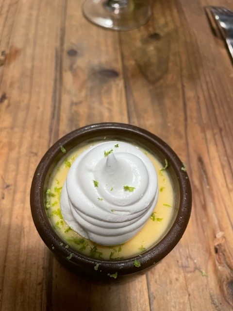 Para el merengue. Montar 3 claras de huevo junto a 3 cucharadas de azúcar y unas gotas de limón hasta obtener un merengue, estirar en la forma deseada sobre un papel de horno y colocar encima sésamo yralladura de limón y secar en el horno a 85 grados de 1,5 a 2 horas.