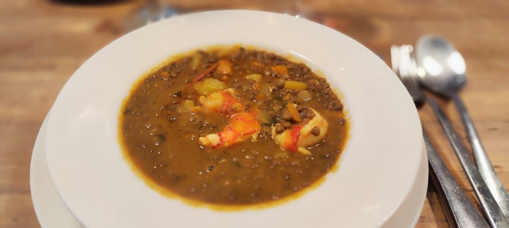Lentejas estofadas con carabineros, curry, limón y hierbabuena (estilo Dabiz Muñoz)