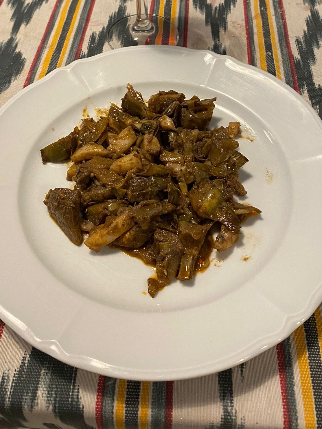Echar buen chorrito aceite y sofreír las alcachofas, añadir una cucharada de tomate por persona y mezclamos para posteriormente tirar y sofreímos el secreto ibérico(100-125 gr por persona).
