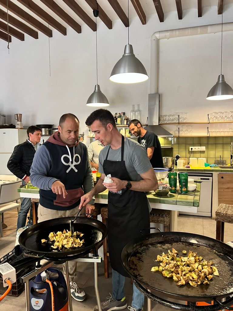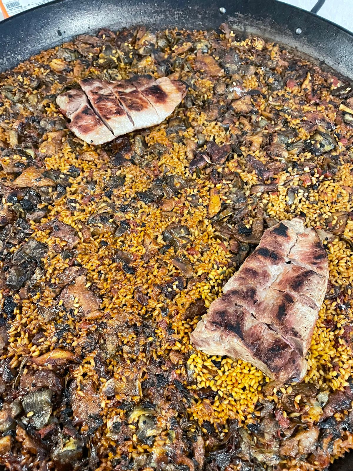 Ingredientes: arroz, caldo de ave, alcachofas, tomate natural, picada de ajo y perejil, secreto ibérico, pimentón, azafrán, cúrcuma, foie, aceite, sal.