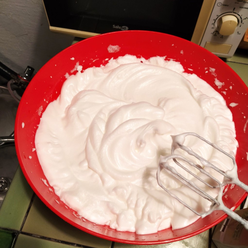 Separar las claras y las yemas. Batir en un bol grande las claras y llevarlas a punto de nieve (ayuda echar un pellizco de sal y una cucharadita de azúcar por cada 2 claras.
