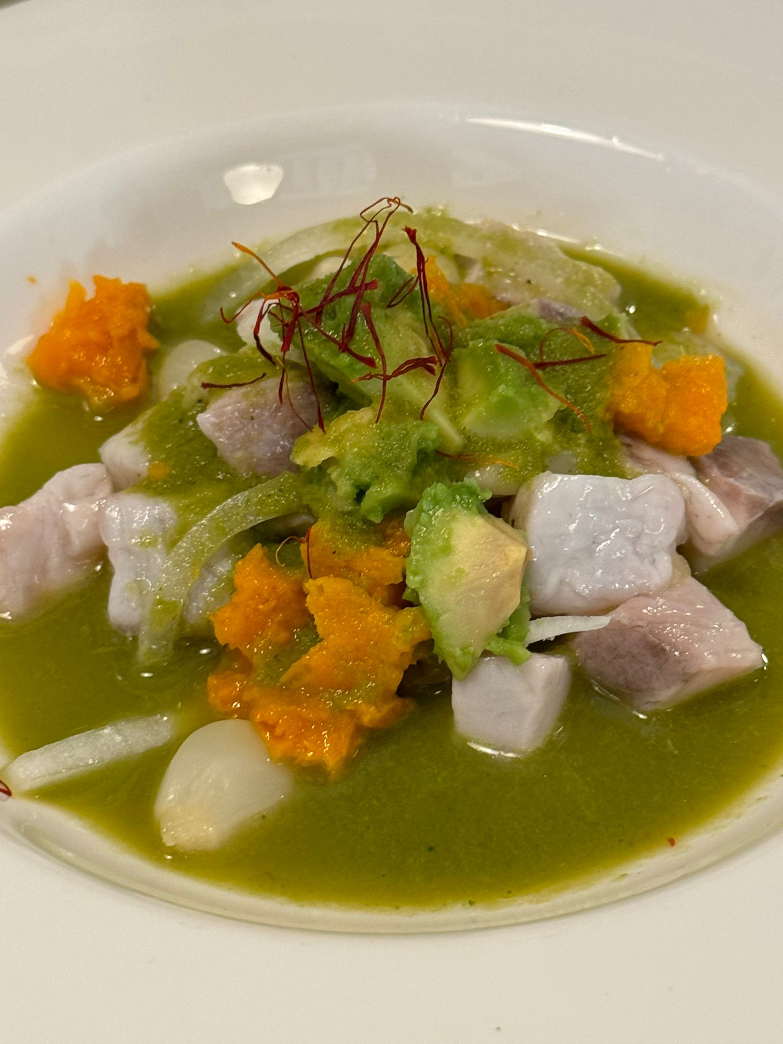 Ceviche de lubina ahumada con leche de tigre