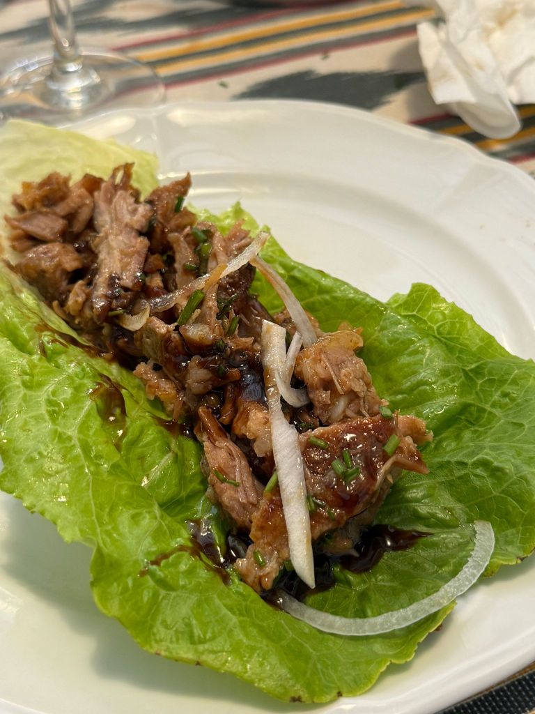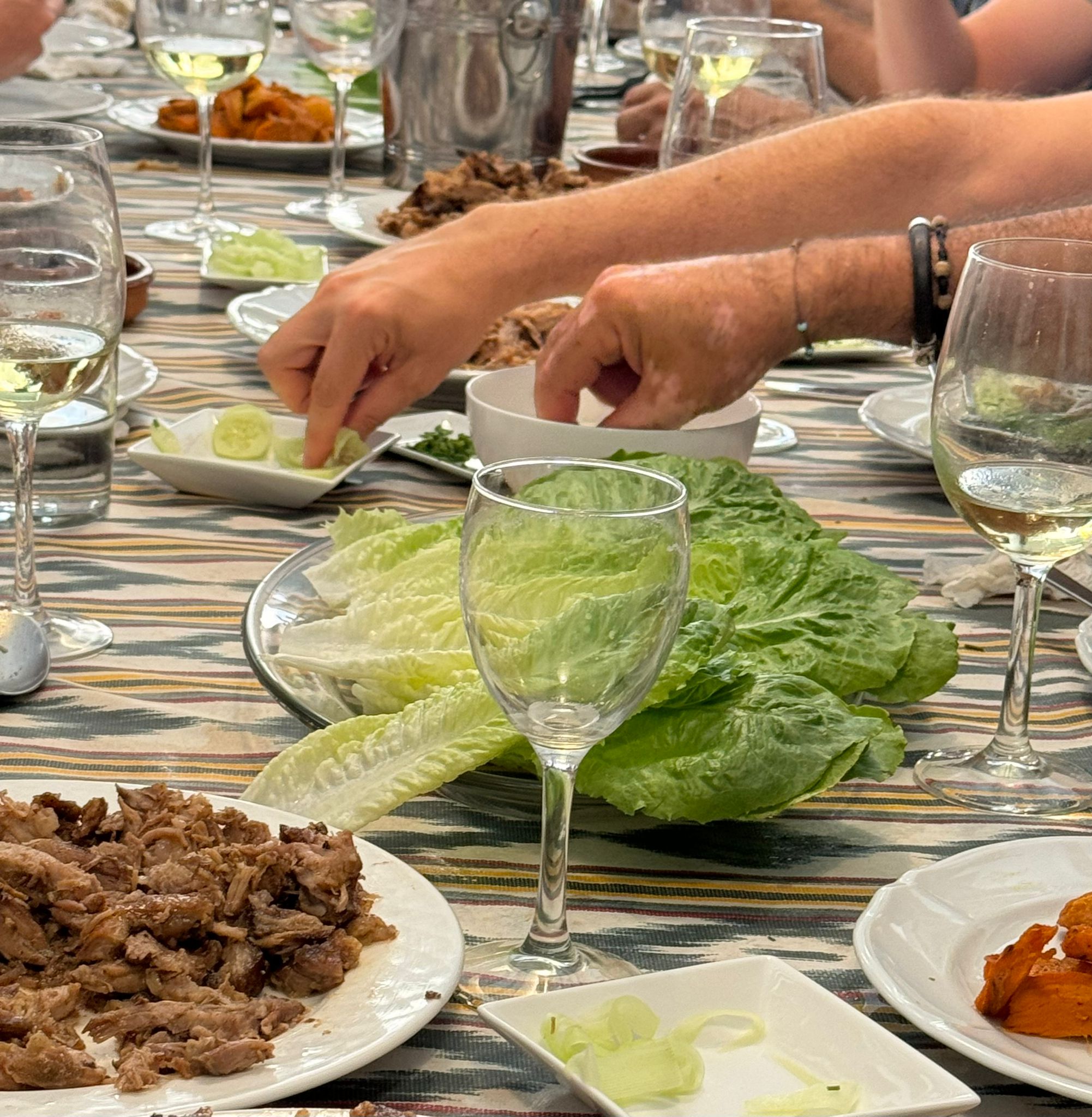 - Lava las hojas de lechuga y sécalas bien. Coloca una porción de carne desmenuzada sobre cada hoja de lechuga.