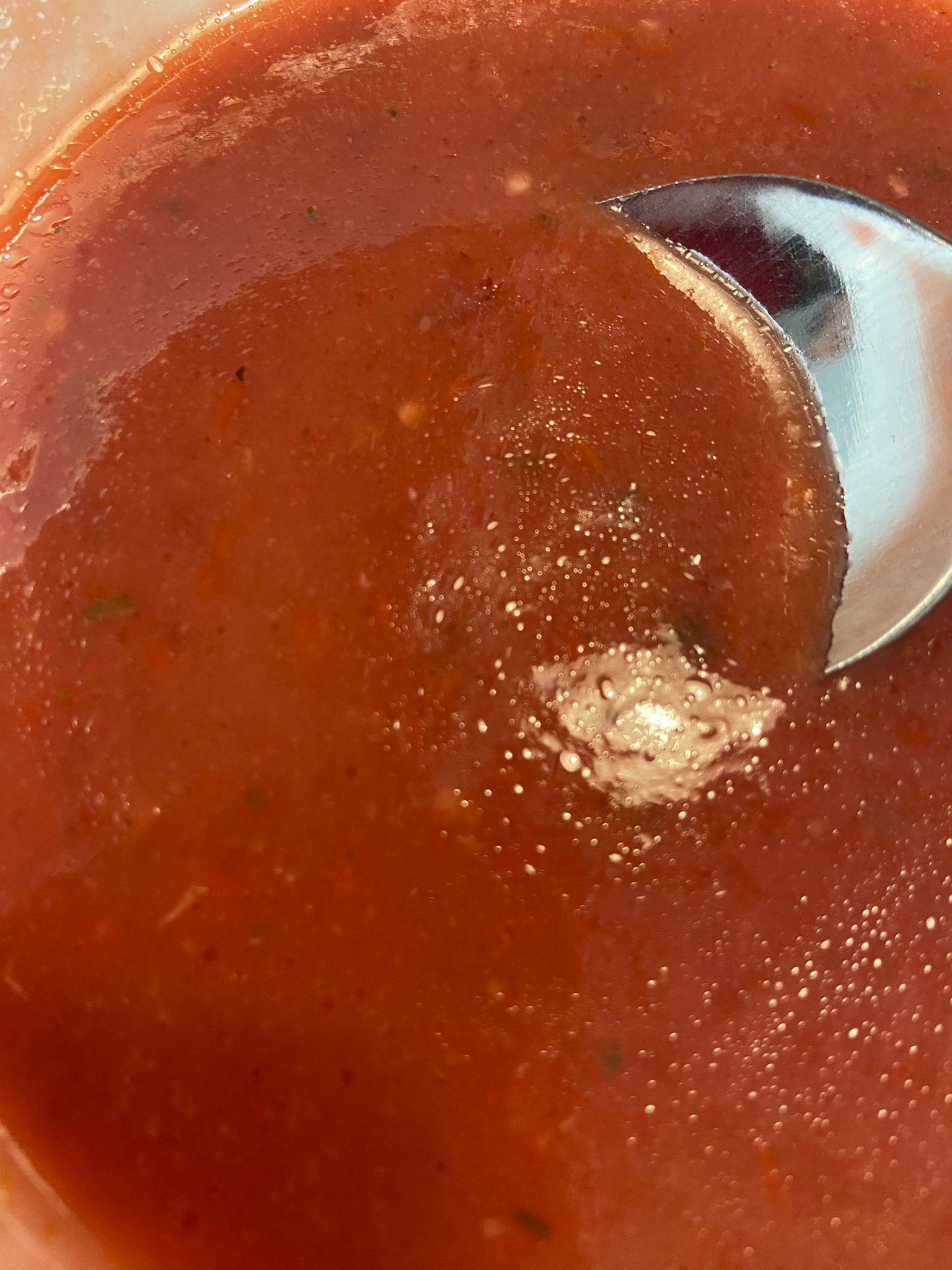 - Vierte el gazpacho en un recipiente y añade el agua fría, mezclando bien.