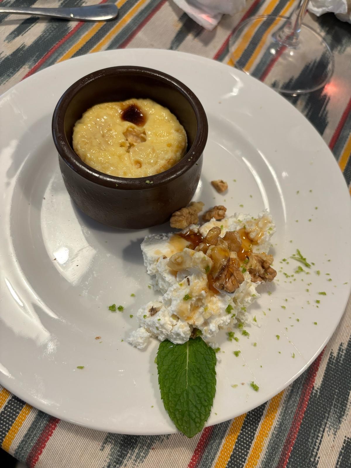Postre: pudding de ensaimada y brossar con miel y nueces.