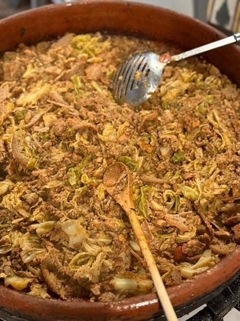* Añadimos la col, y una vez ha reducido tiramos las setas, el butifarrón, 500 ml de agua caliente y dejamos cocer durante 15 minutos.