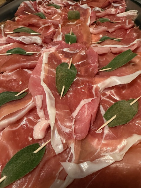 una hoja de salvia y un poco de jamón, sujetando todo con un palillo o brocheta.