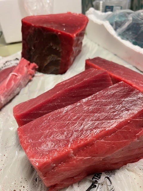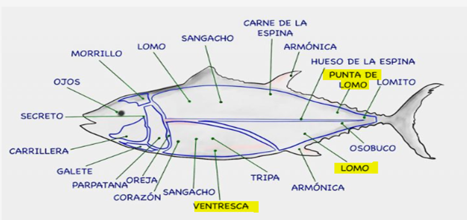 Se procede a extraer todas las partes aprovechables del atún rojo como, la ventresca, solomillo, morrillo, cola negra…en total se extraen 24 piezas, entre partes nobles y partes internas.