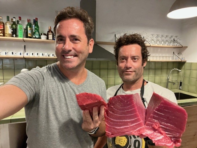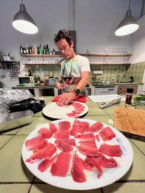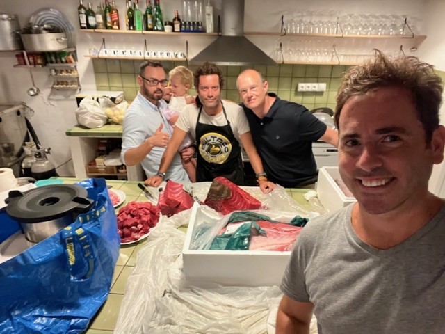 Cuenta la historía que allá por Septiembre de 2024, 4 osados, decidieron introducirse en la milenaria costumbre de la pesca de Almadraba consiguiendo zarpar desde el estrecho hasta la maravillosa isla de Mallorca , en una Garrapatera cargada de Atunes rojos . Durante la lucha en la Almadraba y haciendo uso de su experiencia en la pesca el Fini alias Jose de Cai consiguió sustraer al cerdo del mar – el ATÚN- quien con la ayuda de Shariffi en el arte de la seducción consiguió atraer al atún hasta la costa balear – donde y tras usar una de las 16 bicicletas de Luis DLF – pudimos llegar al cocherón de Es Galliner para comenzar con el ronqueo , y no por sus famosos ronquidos , de Kekesolano , al cuchino japonés y corte fino. Durante días y muchas horas se trabajaron una jornada gastronómica que consiguió encandilar a los asistentes siendo una de las más numerosas de la asociación así como de la más cara (por el alto precio de juntar estos 4 caprichitos de cocineros).