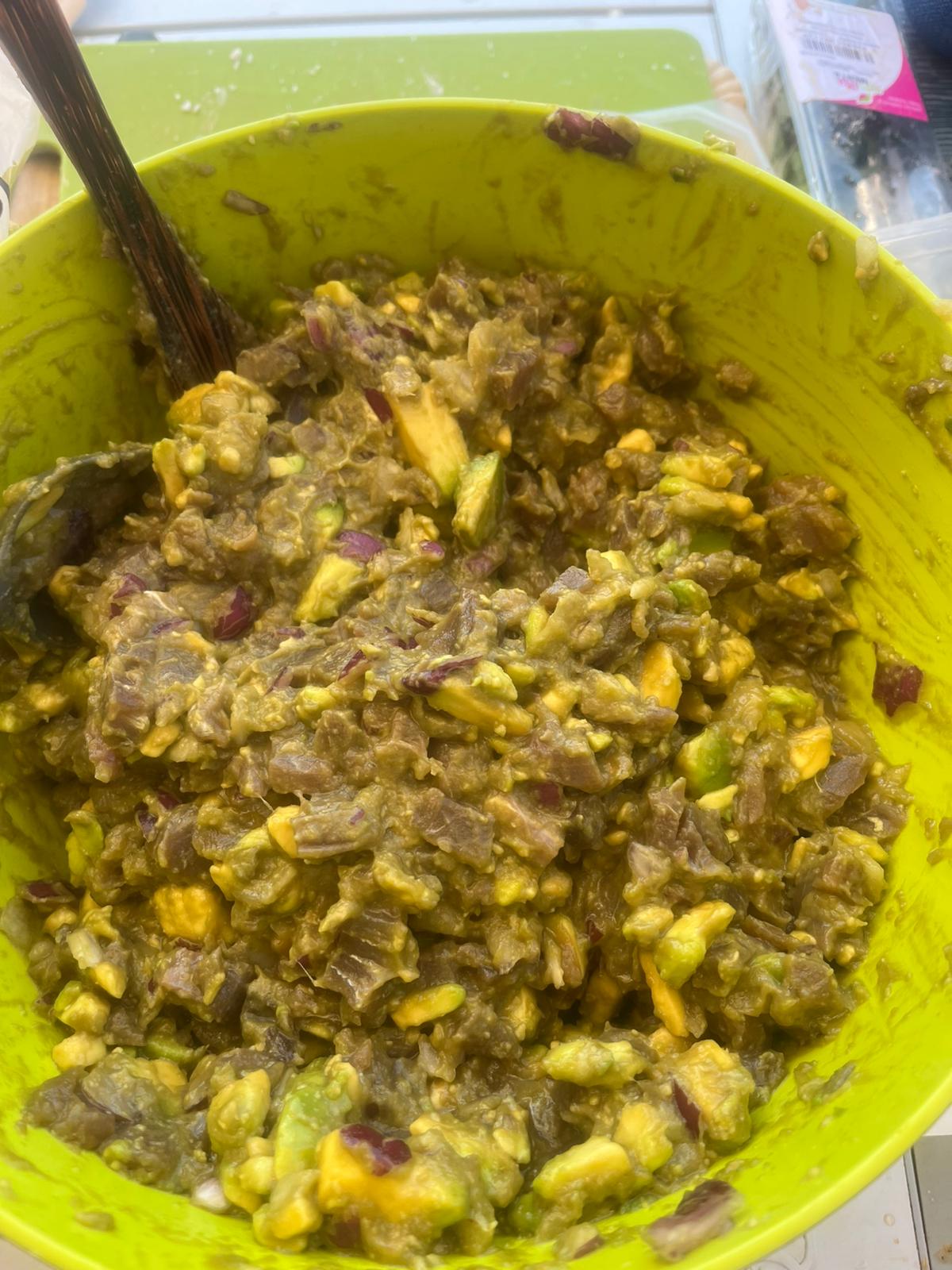 - Mezcla con cuchara o espátula, apretando ligeramente el aguacate contra el atún hasta conseguir una mezcla ligada pero rústica.
